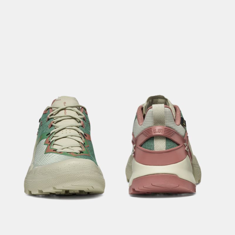 La membrana impermeabile in tecnologia GTX mantiene il piede asciutto anche in condizioni di umidità o pioggia, mentre la tomaia in poliestere con filato di poliammide ad alta tenacità e poliestere riciclato al 100% assicura resistenza e leggerezza.