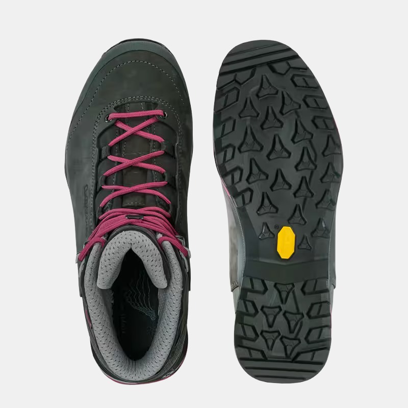 L’intersuola DYNAPU® offre ammortizzazione affidabile e un comportamento di rotolamento armonioso, mentre la suola Vibram LADY TRAC® con bordo del tallone pronunciato assicura trazione superiore su ogni terreno, in salita e in discesa. E quando la tua avventura dura anni, la scarpa può essere risuolata, confermando il suo valore di compagna fedele per ogni sentiero.