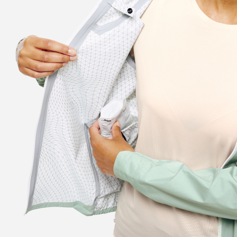 Omologata per le competizioni, ultraleggera (164 g) e altamente comprimibile, si ripiega nella propria tasca con cappuccio fino a scomparire nello zaino, pronta a entrare in azione al primo segno di pioggia.