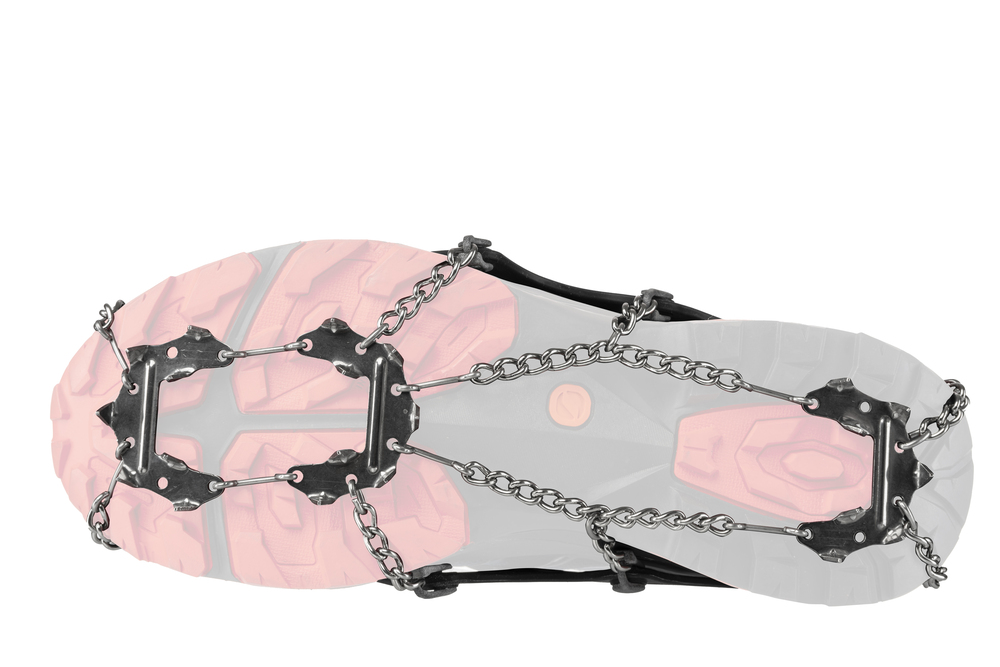 Calzata rapida e ottimale aderenza alla calzatura grazie all‘elastomero hi-tech Ideale su ghiaccio, fango e terreni scivolosi grazie al sistema a punte in acciaio.
