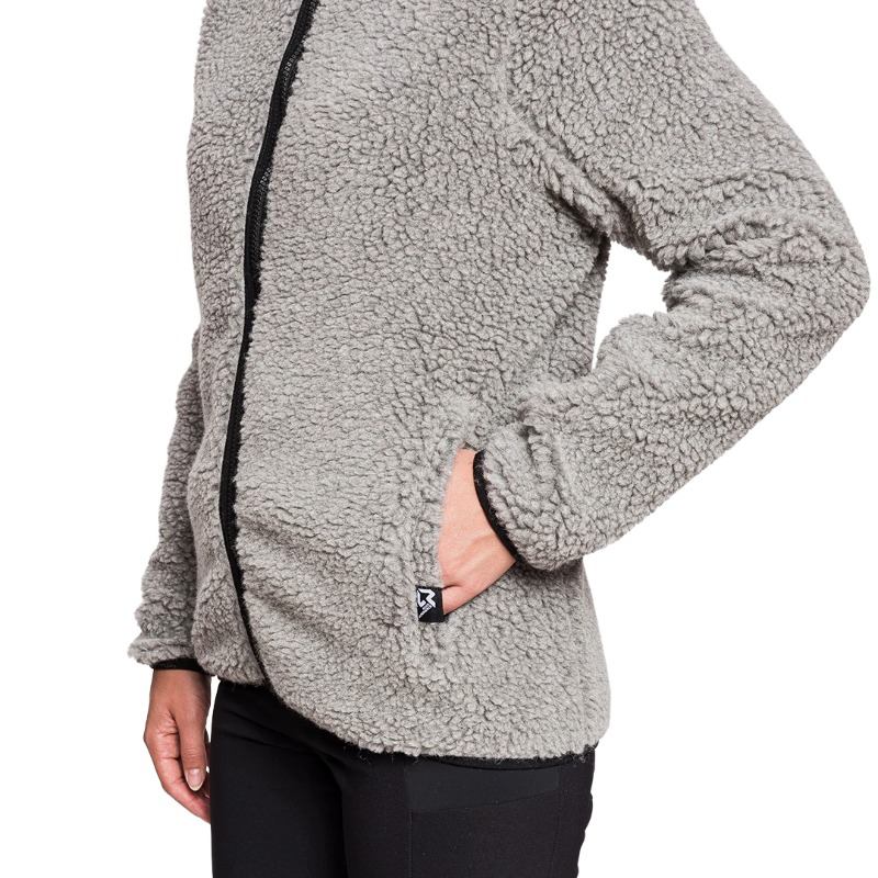 La parte frontale della felpa è realizzata con tessuto jacquard sherpa pile rinforzato con un materiale tecnico protettivo dal vento, posizionato sul petto, la parte superiore della schiena e il colletto.