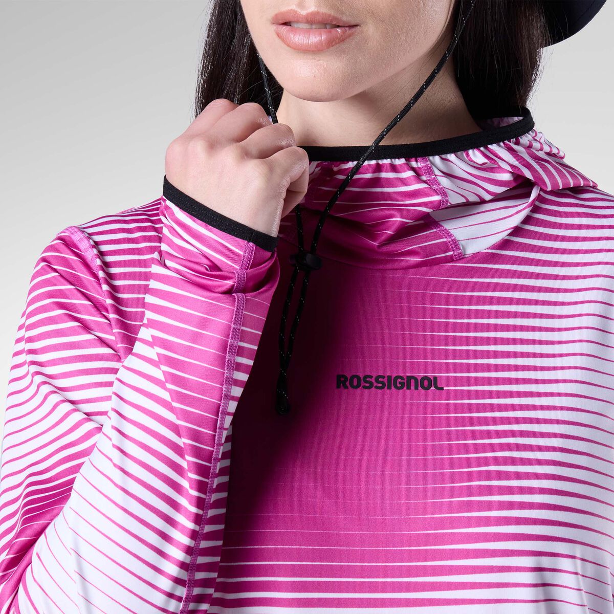 Dettagli Trama del Tessuto - Recycled Light Jersey Melange Finitura – Heiq CoolUPF 50+ Tessuto – 92% Recycled Polyester 8% Elastane Grafica – 3D Transfer Rosignol on Chest Cappuccio – Fixed Hood