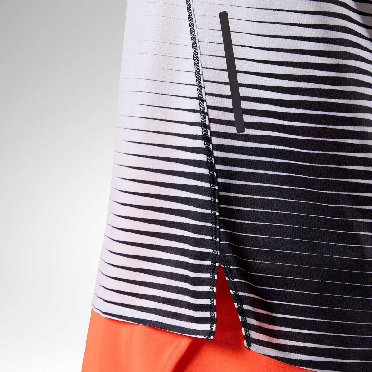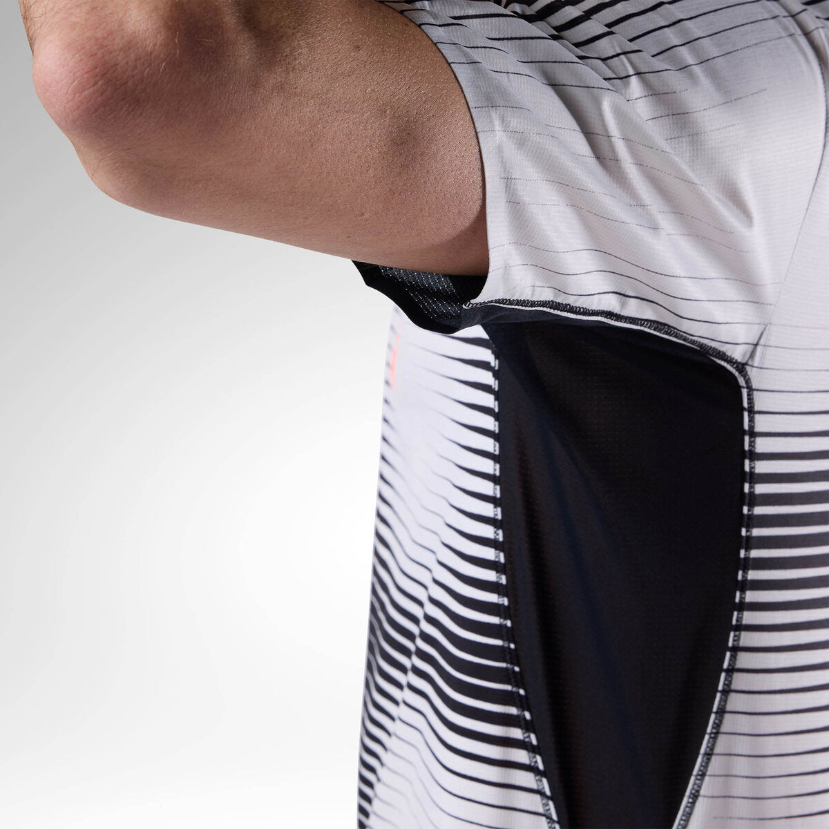 Il tessuto jersey in poliestere riciclato è leggero e morbido sulla pelle, mentre gli inserti in mesh migliorano la ventilazione e favoriscono una rapida dispersione dell’umidità.